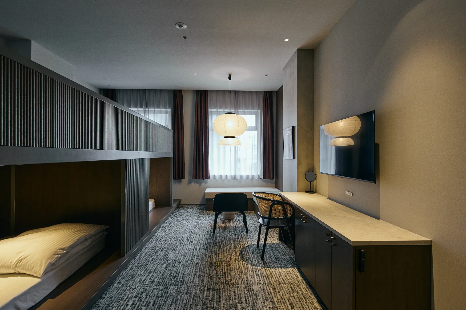セミダブルベッドを1〜2台備えたモデレートタイプ。