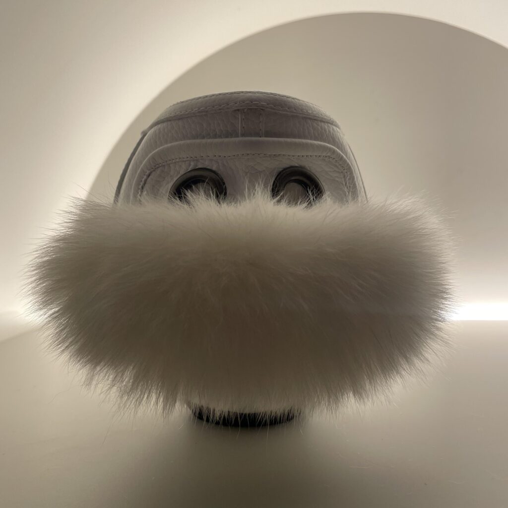 黒は型押し牛革とイミテーションファー、白は型押し牛革とフォックスファー使用